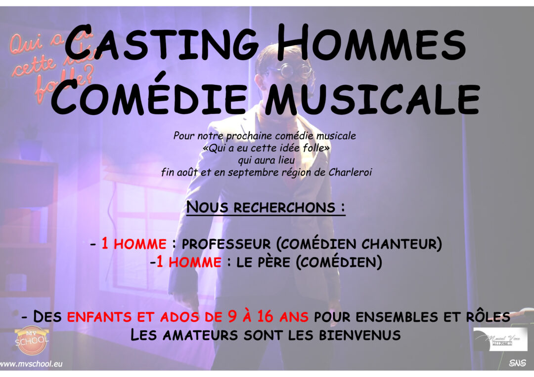 Nous lançons les auditions pour la prochaine production: « Qui a eu cette idée folle », une comédie musicale pétillante et pleine d’énergie, qui sera jouée fin août et en septembre dans les salles de la région de Châtelineau, Aiseau-Presles et Sambreville.